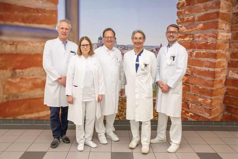 Über die Zertifizierung des Pankreaszentrums des Klinikums freuen sich Prof. Dr. Helmut Grimm (2.v.r.), Chefarzt der Allgemein- Viszeral-, Thorax-, Gefäß- und Adipositaschirurgie sowie Leiter des Pankreaszentrums, Prof. Dr. Thomas Südhoff, Chefarzt der Hämatologie Onkologie sowie Leiter des Onkologischen Zentrums (l.), Ärztlicher Direktor und Chefarzt der Gastroenterologie Prof. Dr. Matthias Wettstein (Mitte), Dr. Julia Lanznaster, Koordinatorin des Zentrums für Onkologische Neoplasien, und Zentrumskoordinator des Pankreas- und des Darmkrebszentrums Dr. Oliver Heupel. Foto: Klinikum