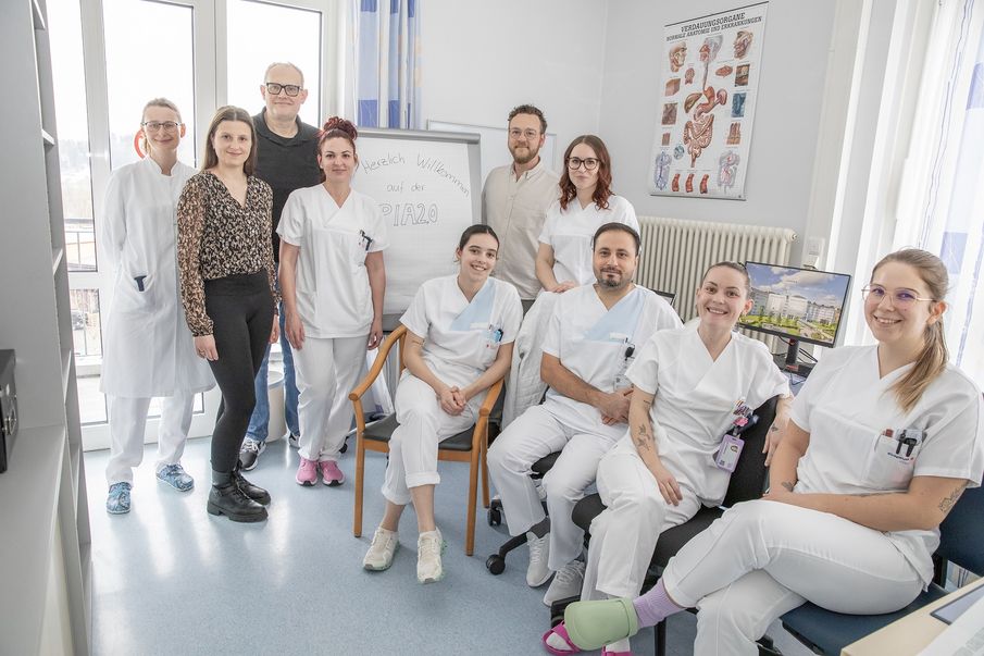 Herzlich Willkommen auf der PIA 2.0 heißt es für die Pflege-Azubis und Pflegekräfte in Anerkennung. Begeistert vom Projekt sind auch Praxiskoordinatorin Johanna Kapsner (hinten v.r., Markus Feilhuber, stellvertretender Schulleiter der Berufsfachschule für Pflege, Stationsleitung Magdalena Reisinger, Andreas Lindmeier von der Pflegedirektion, Pflegepädagogin Chiara Jarosch (2.v.l.) und Oberärztin Dr. Martina Salzinger (l.). Foto: Klinikum