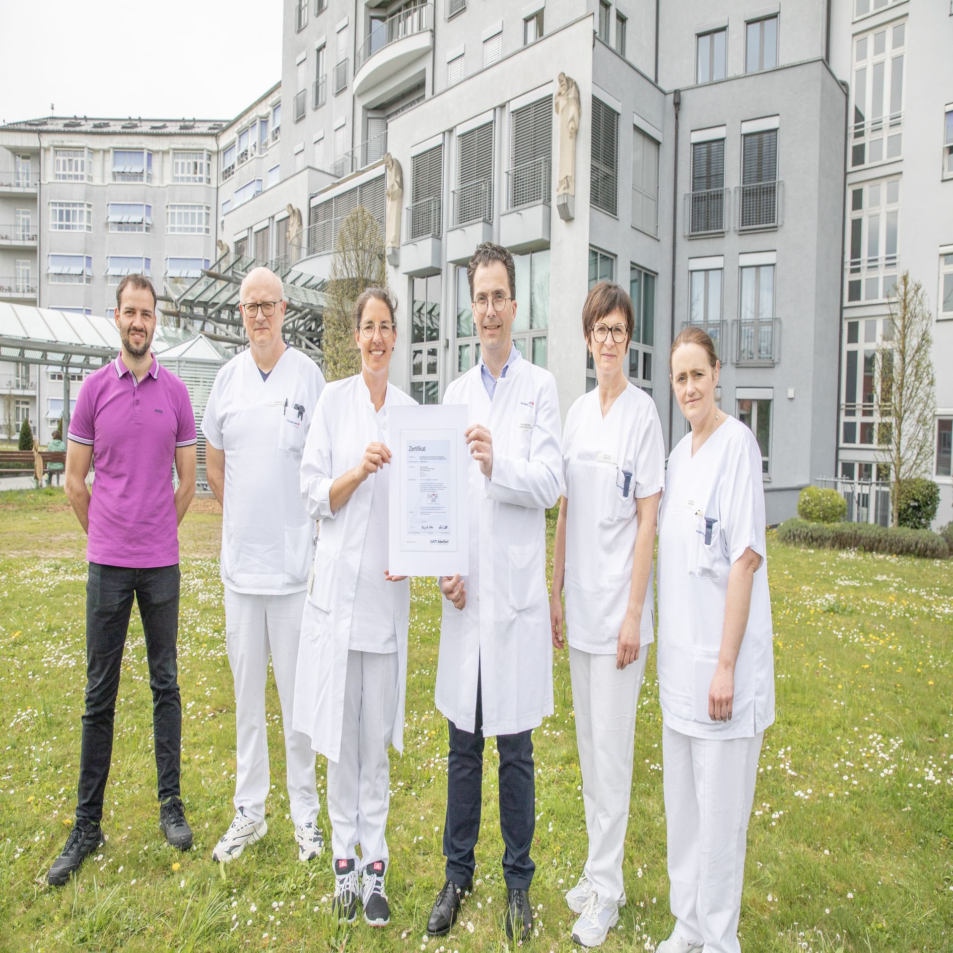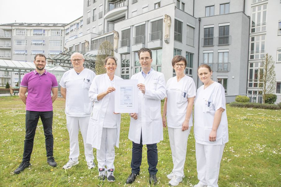 Das Team um Chefarzt Prof. Dr. Tobias Freilinger (3.v.r.) freut sich über die bestandene Rezertifizierung der „Stroke Unit“. Auf dem Foto (v.l.) Benedikt Pößnecker vom Qualitätsmanagement des Klinikums, Helmut Freund von der Pflegedienstleitung, Lisa Gartner, oberärztliche Leiterin der Stroke Unit, pflegerische Stationsleitung Bettina Stocker und Kerstin Biereder (Sekretariat und Studienassistenz Stroke Unit). – Foto: Klinikum